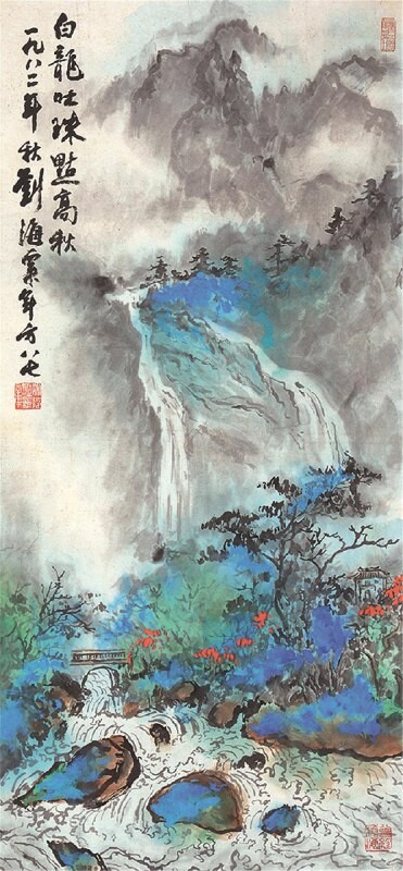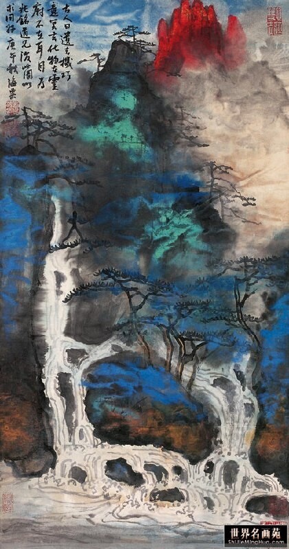 Приемы классического китайского пейзажа и сочетание традиционных элементов с цветными пятнами и брызгами.